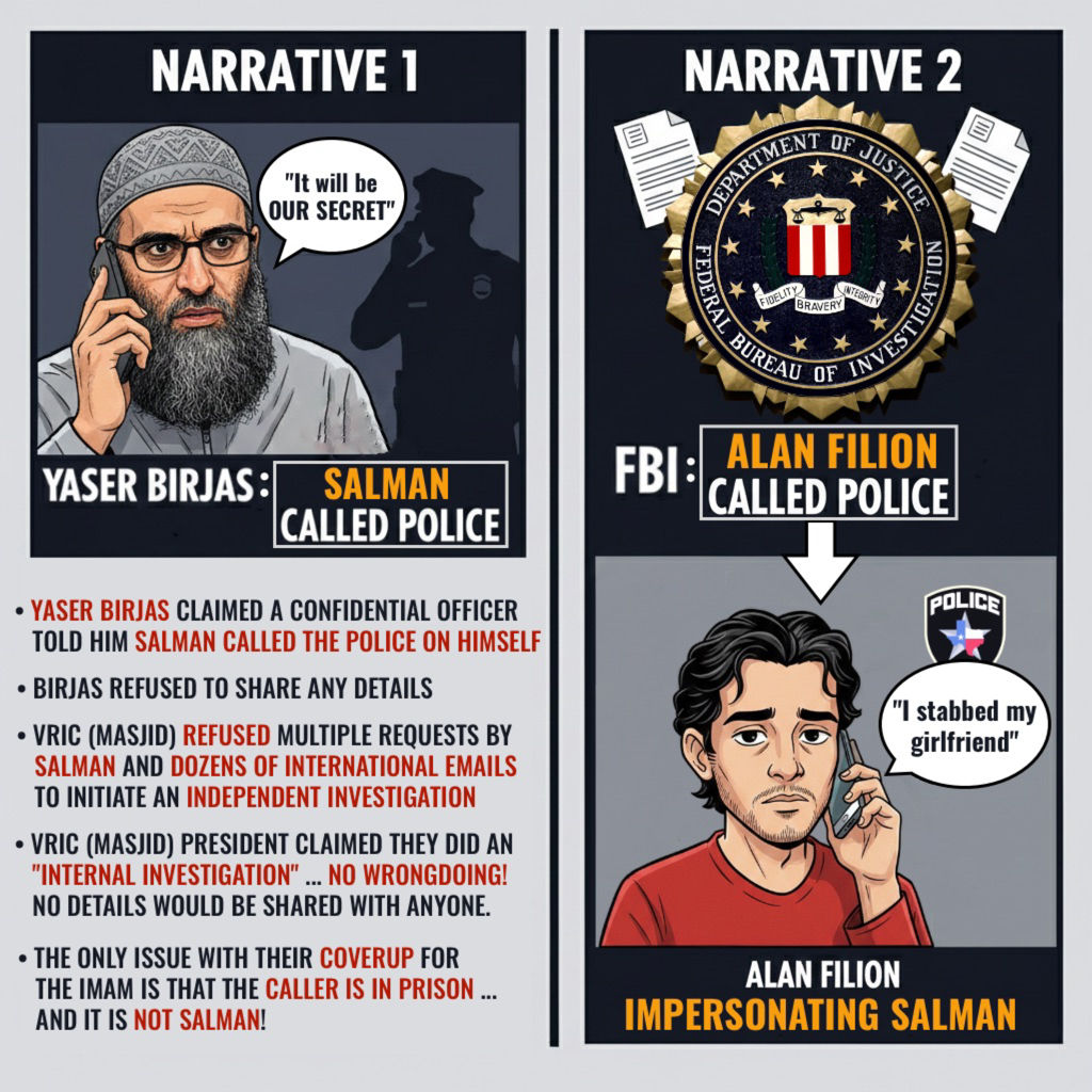 The case with my local masjid, VRIC, is a very simple one. The shuyūkh (Yaser Birjas and Omar Suleiman) claim that they had spoken with the Irving police on the day of the swatting attack and that the police told them: the call originated from Salman’s home and that, in essence, I staged the swatting attack against myself.