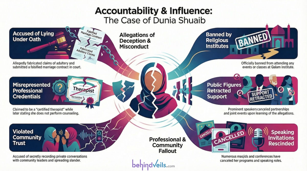 This page serves as a comprehensive exposé on the actions and behaviors of Dunia Shuaib, unraveling a pattern of deceit, manipulation, and ethical/religious violations that have caused immense harm to individuals, families, and the broader Muslim community. The aim is to bring clarity and justice by presenting verifiable evidence, including court filings, audio recordings, video footage, and additional documented events.